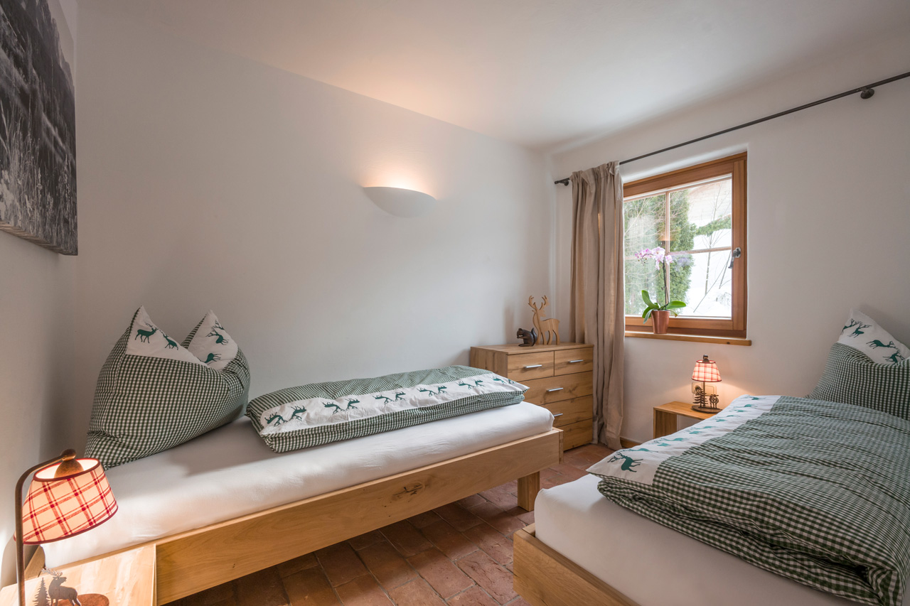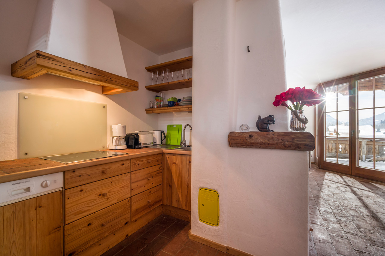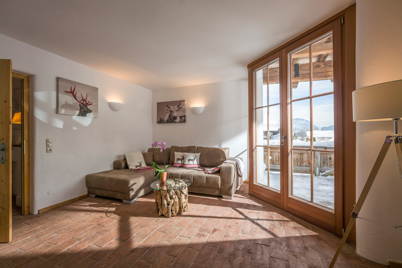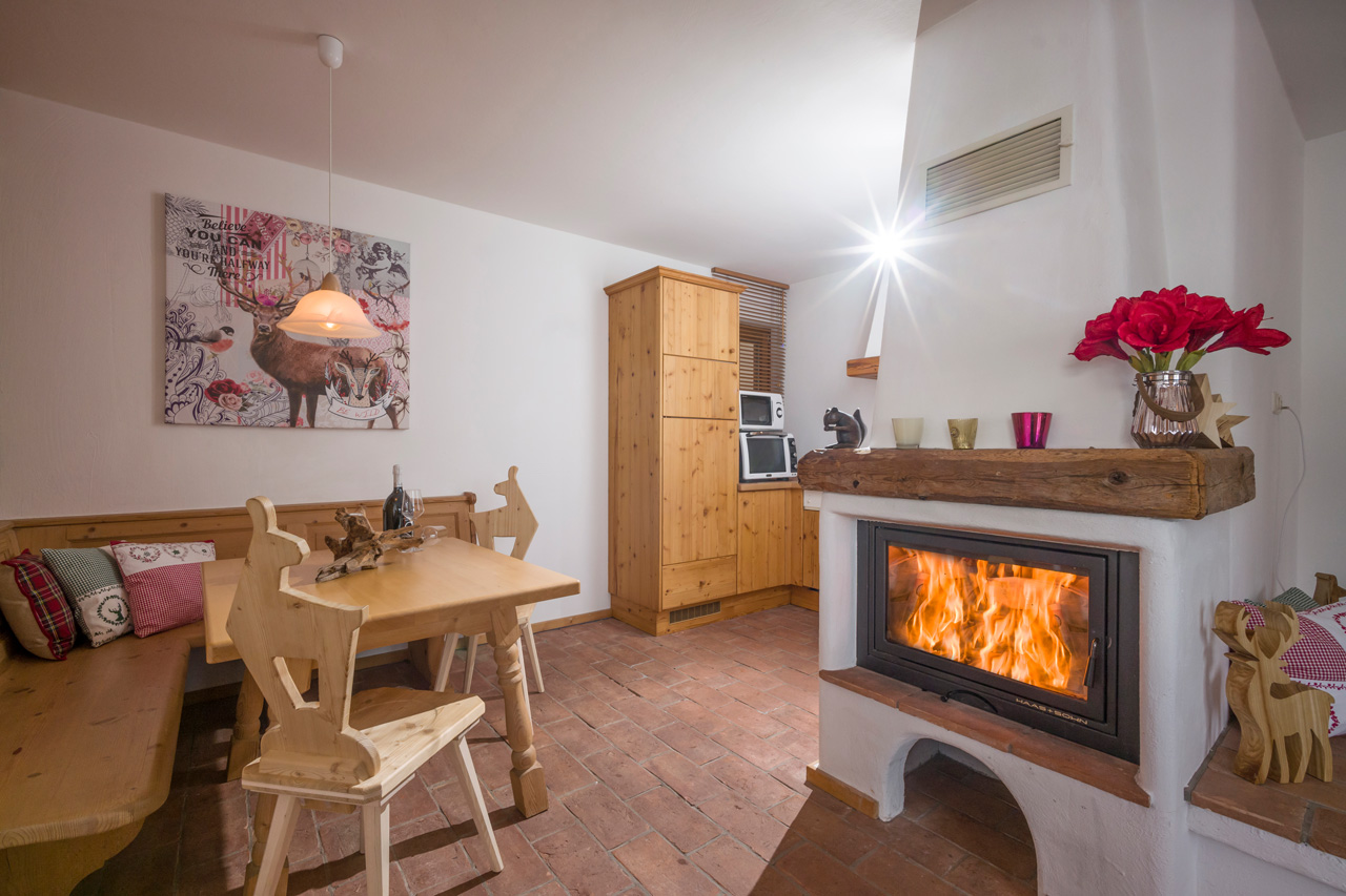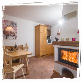 2 bedrooms (one with double bed and one with two single beds), one bathroom, separate toilet, living room with open fireplace, kitchen-living room with sitting area, covered terrace. Satellite TV, underfloor heating, dishwasher, microwave, Nespresso coffee machine, filter coffee machine, kettle and washing machine are available. Baby chair and bed on request. Pets allowed (15.- Euro/day).