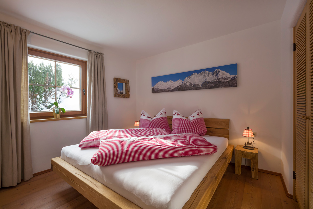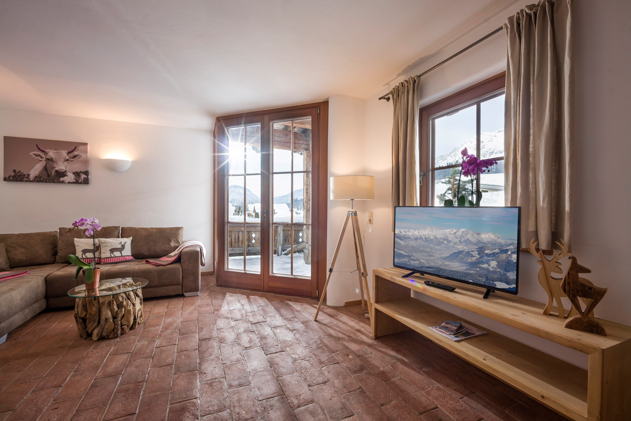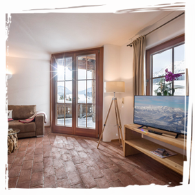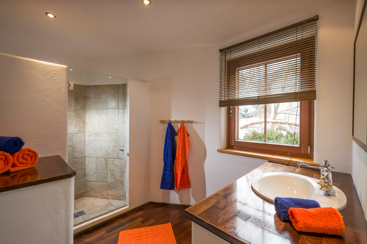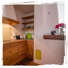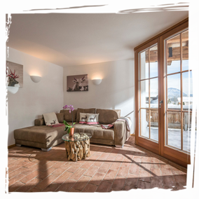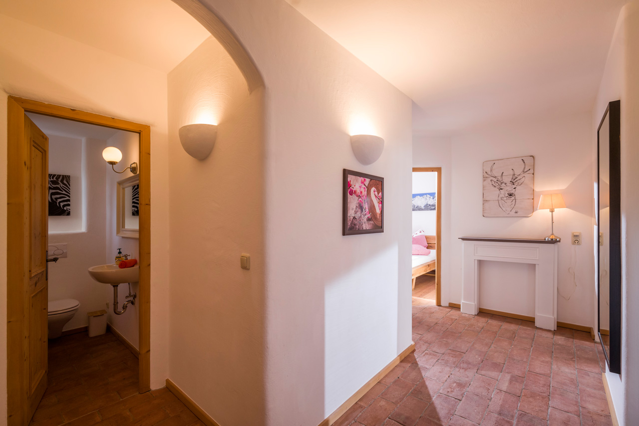 2 bedrooms (one with double bed and one with two single beds), one bathroom, separate toilet, living room with open fireplace, kitchen-living room with sitting area, covered terrace. Satellite TV, underfloor heating, dishwasher, microwave, Nespresso coffee machine, filter coffee machine, kettle and washing machine are available. Baby chair and bed on request. Pets allowed (15.- Euro/day).